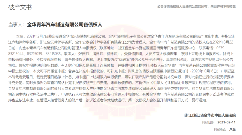 2021年2月7日,金华市中级人民法院作出(2021)浙07破申1号民事裁定,裁定受理金华青年汽车制造有限公司破产清算申请,并于同日作出(2021)浙07破4号决定,指定浙江六和律师事务所、浙江金元律师事务所、金华安泰会计师事务所有限责任公司为青年制造公司临时管理人。