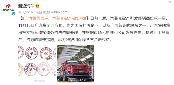 针对网上曝光的“广汽菲克破产引发26家经销商集体维权“事件,11月15日,广汽集团做出回应。广汽集团表示,作为国有控股企业,以及广汽菲克的股东之一,广汽集团将积极支持其债权债务依法依规处理;并根据市场化原则和公司发展需要,探讨活用其资产、资源的重整措施,尽力维护和保障各方合法权益,届时会根据信披要求进行相关披露。同时,广汽集团将督促广汽菲克根据《汽车销售管理办法》《企业破产法》等法律法规,配合破产管理人依法依规作出安排。