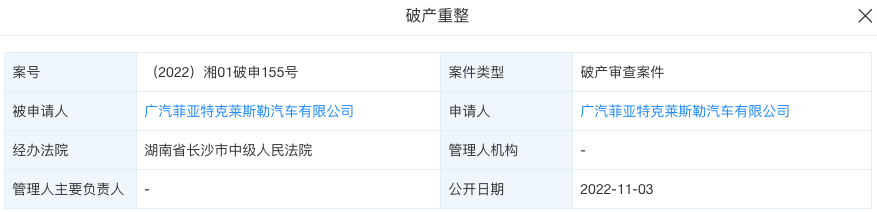11月3日,天眼查App显示,广汽菲亚特克莱斯勒汽车有限公司新增破产审查案件,申请人为上述公司,经办法院为湖南省长沙市中级人民法院。这也意味着,在华成立12年的合资车企广汽菲克正式申请破产重整,不过深陷破产重整事宜的广汽菲克很快面临多家经销商集体维权。