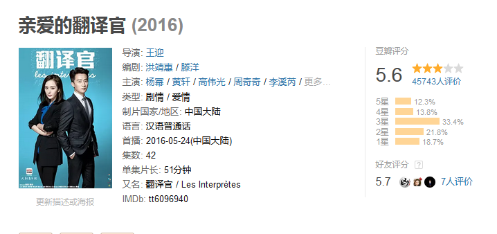 杨幂和黄轩以及黄子韬分别主演的《亲爱的翻译官》和《谈判官》在豆瓣的口碑都不是很好,特别是《谈判官》完全被拍成偶像剧,豆瓣评分才3.5分,这分太低了。
