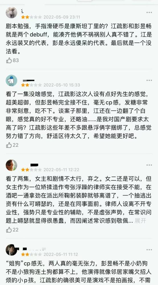 网友们的评价都很中肯,没有蓄意去抹黑,应该是实事求是。江疏影可能没见到过不同的律师,律师不是用鼻子看人,而是用眼睛看人,看得很仔细。的确就像网友们评价的,律政剧如果突出案件的看点,那么就很容易像纪实作品,如果为了迎合观众口味,则很容易成为偶像剧或家庭伦理剧。