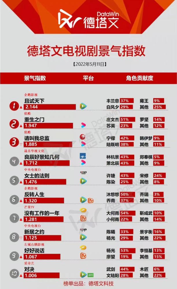 最火热的剧还是流量明星们主演,比如《且试天下》是杨洋和赵露思主演,《重生之门》是王俊凯和张译主演,《请叫我总监》是林更新和谭松韵主演。《女士的法则》江疏影和彭昱畅都不能算流量明星吧?
