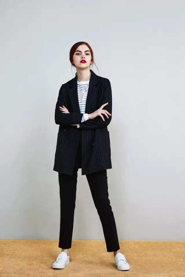 想要有来去如风的干练感,修身小西装外套搭配条纹衫,再来个运动鞋mix&match