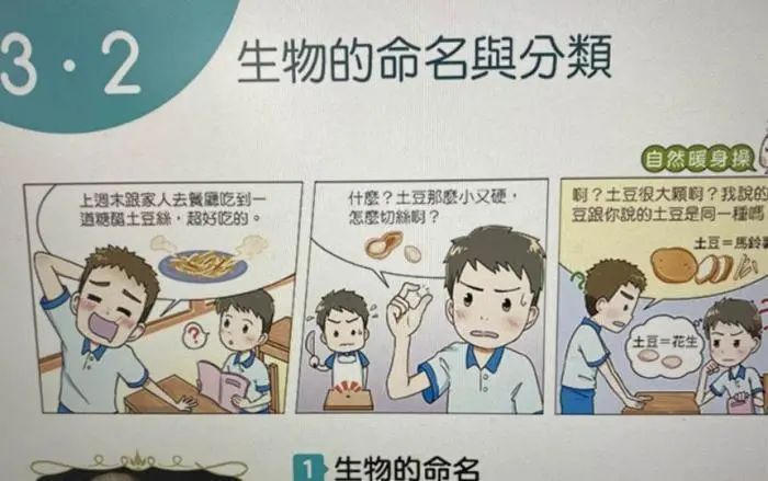 这本引发争论的生物课本题为“3-2生物的命名与分类”,将马铃薯称之为“土豆”。出版公司表示,该课本包含了生活中使用的一些不同词语,讲的都是同一事物,例如:土豆,也可称为 “落花生”“花生”“马铃薯”“洋芋”;青椒,也可称为“灯笼椒”“柿子椒”“菜椒”“大椒”,让学生了解学名对于沟通的重要性。