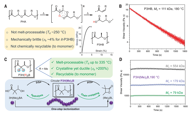 )团队开发了一类不包含α-氢的PHA,在热分解过程中不会轻易发生顺式消除,从而显著提高了聚合物的热稳定性。同时,这种简单的α,α-二烷基取代也使得 PHA可熔融加工,还具备有很好的延展性和韧性、固有的结晶度和重要的闭环化学可回收性,从而同时解决了PHA存在的三个长期挑战。相关论文发表在Science?期刊,第一作者为Li Zhou(周立)博士,Zhen Zhang(张震)博士为共同第一作者。