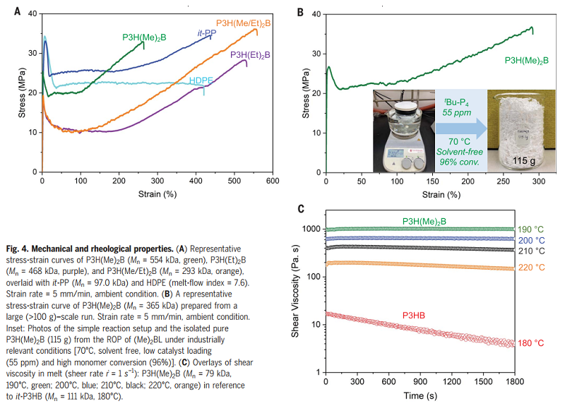 等规聚(3-羟基丁酸酯)的拉伸长度通常只有4%左右,因而极大限制了其应用。拉伸测试表明α,α-二烷基取代的策略完美的解决了机械脆性的问题,从而赋予聚合物优异的及可媲美传统聚烯烃高分子的材料性能。比如双甲基和双乙基取代的共聚物不仅具有517%的拉伸长度,而且其极限拉伸应力高达34 MPa。值得一提的是,放大量得到的高分子具有相似或更好的机械性能,从而初步验证了其大规模生产应用的可行性。熔融温度下的剪切粘度测试表明,等规聚(3-羟基丁酸酯)在180 °C 温度下会迅速热解。而α,α-二烷基取代的聚(3-羟基丁酸酯)由于其高分子链内不再具有α氢原子引起的消除热解途径,从而在190-220 °C的温度区间都表现出优异的热稳定性,因此使该类材料的热加工成为可能。