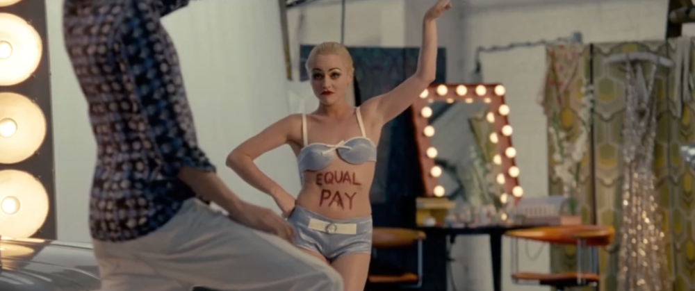听到丽塔的话,桑德拉惭愧不已,趁着拍摄间隙在肚子上写下了:EQUAL PAY(同工同酬),以示抗议。
