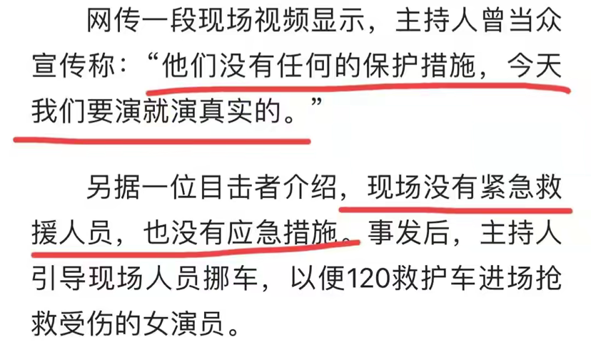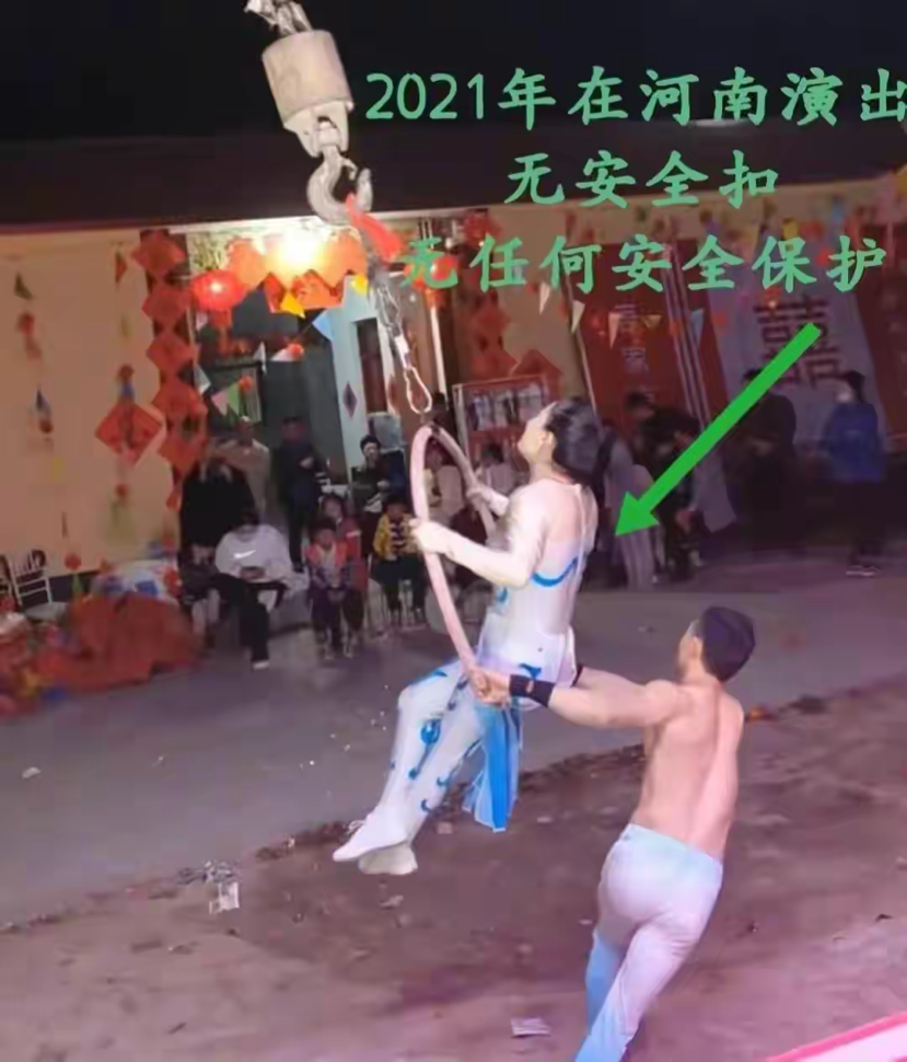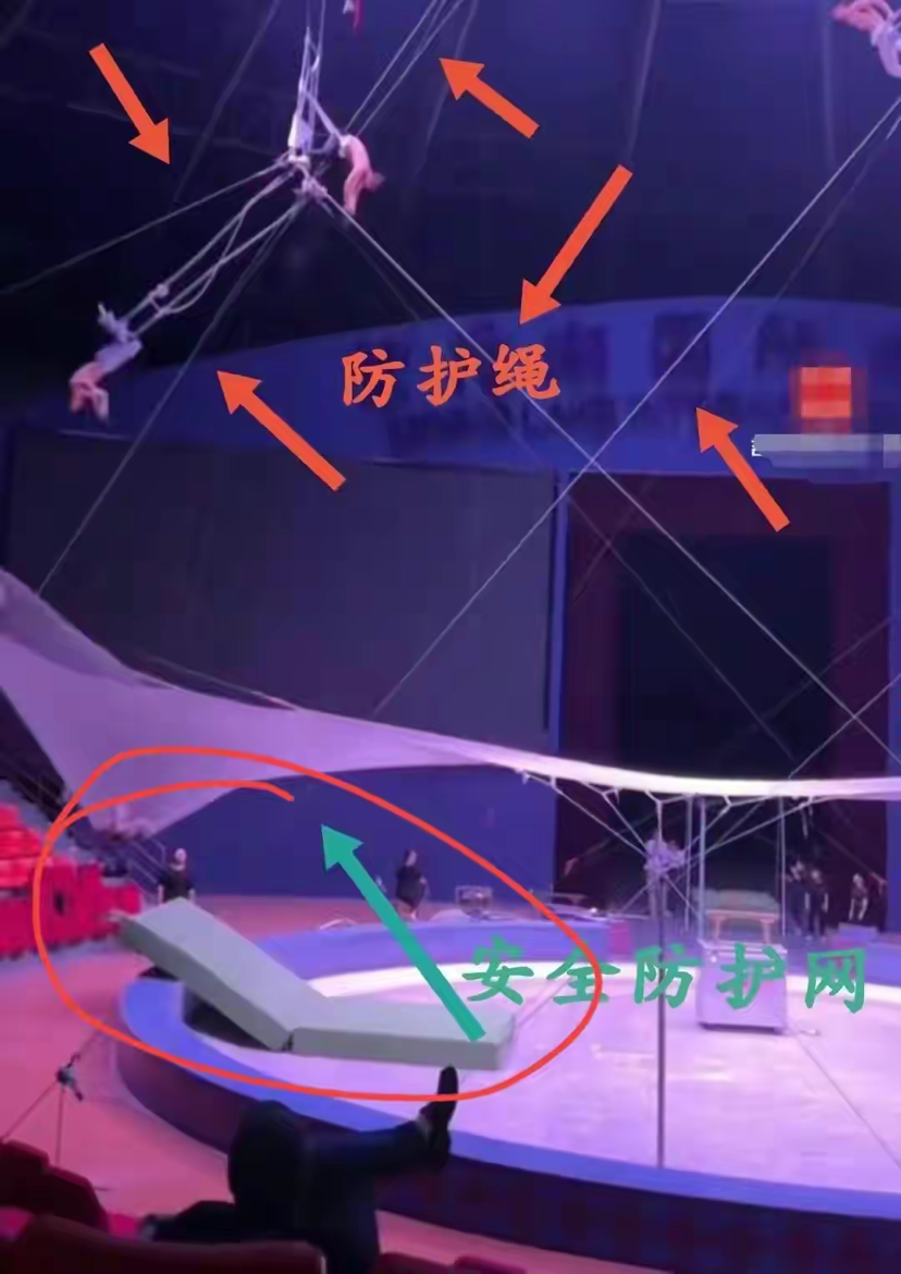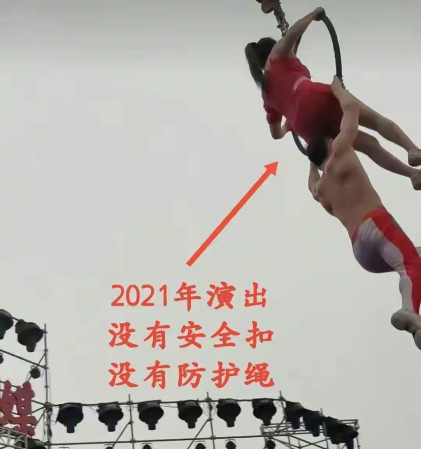 上半句:来演出的时候还叫他(她)扣(安全扣),再次表明自己(公司)对演员演出时的履行了相关义务,而且是演出之前还在重申要扣安全扣,可是实际情况呢?真是这样做的吗?我们来看看该公司该节目的宣传噱头和之前历次演出实际情况是怎样的!我想问一句,节目中这些安全扣、安全绳、防护网到底是演员自己要准备的还是公司要指定专门人员负责的?两个人又要在空中表演,又要在下面准备好防护网、防护垫?还要在旁边拉着安全绳?