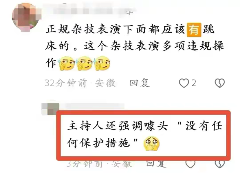 这是网友曝出的该次节目的宣传噱头:就是没有任何保护措施。可能公司这样宣传是为了表明节目的精彩之处,也是表明演员的技术高超,可是这种节目真的可以不做任何防护就表演吗?答案是否定的!那么看看人家的正规表演是怎么做的吧!