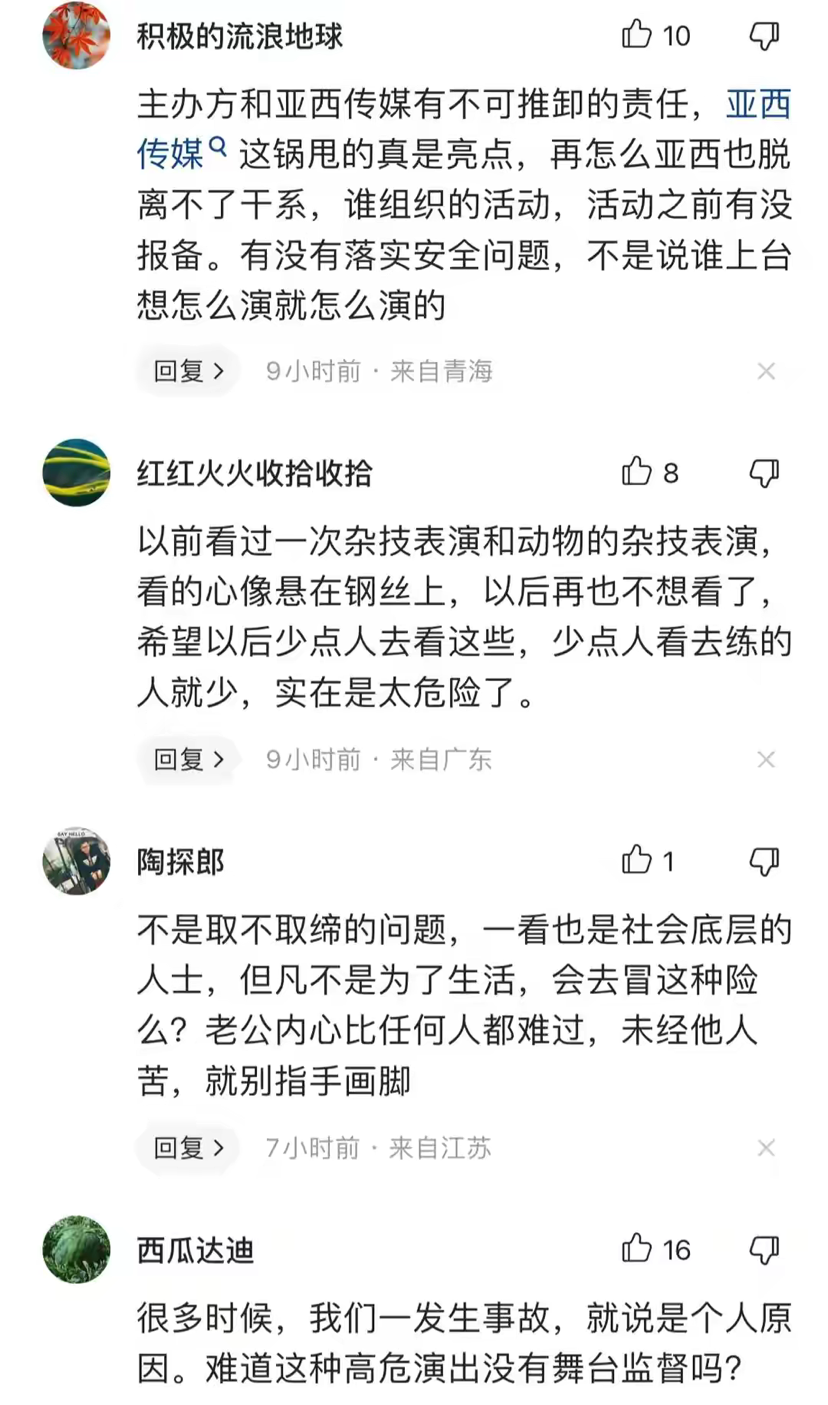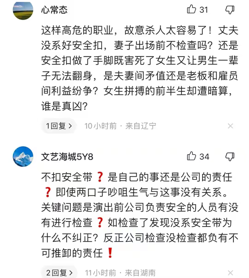 随着舆情发酵,坠亡事故的相关细节也被媒体扒出,通过官方通报和现场视频来看,这起事故应该就是一起演员在演出过程中发生事故造成死亡的工伤案件,官方通报出来后,该演员所属的演艺公司根据工伤标准来履行赔偿义务就行了,至于演艺公司本身及当地邀请演艺公司演出的行为是否合法合规这是相关部门的职责,相信出了人命关天的大事,肯定不会无疾而终的。可是该坠亡女演员所属公司安徽亚西演艺传媒有限公司发言人对媒体发布的一段话却成功引起了网友的格外关注。我们看看亚西公司这位领导是怎么说的!亚希传媒王总对记者采说了以下的话:她是意外,她两口子生气了,等?出?过?这件事情?以后,才知道他们俩生气了。她搂他没搂住,扣她没扣住。他在派出所里也说过是意外。演了三四年了,没出现过这样的问题。来演出的时候,还叫她扣安全扣,我们熟练的很,我们上过央视,都说了一定要注意安全,说了10遍都得有。这里面有几句话,我听着很不舒服,摘抄如下,说一下我的个人意见。第一句:他两口子生气了,等出过这个事情以后才知道他俩生气了。