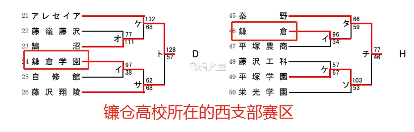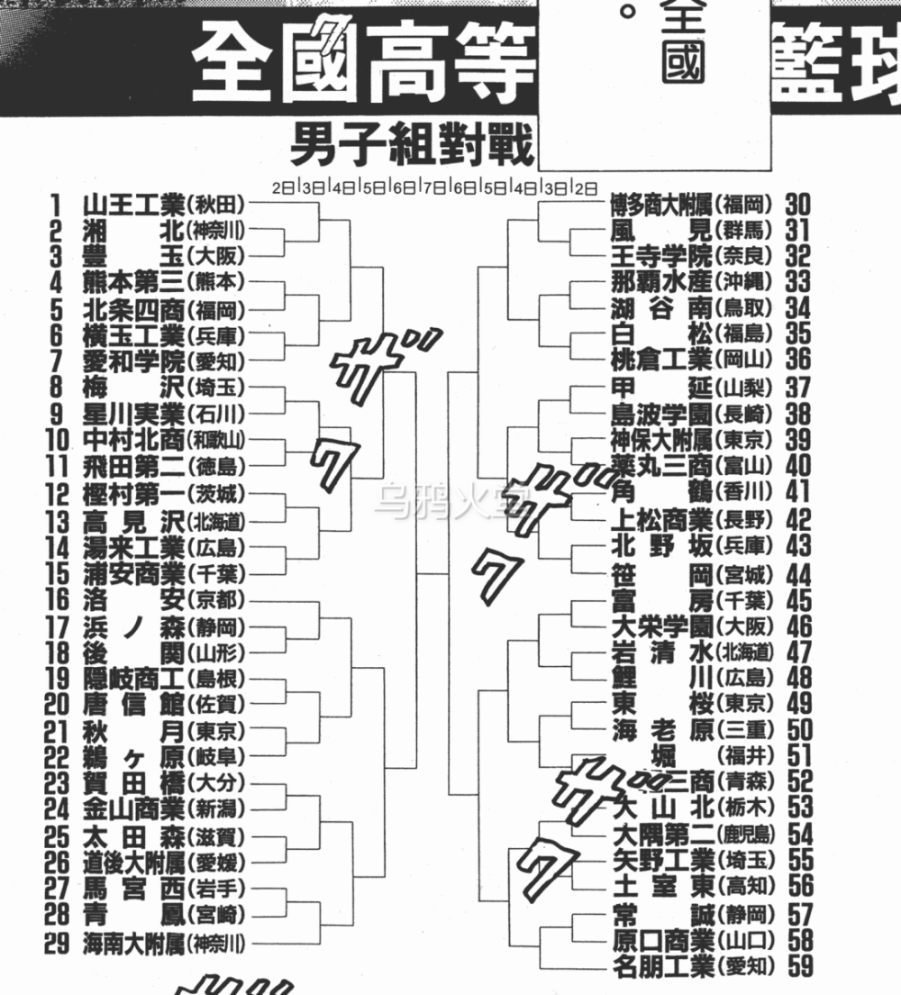 可见,这就是县大赛的预选赛,或者是资格赛,先刷一波队伍,胜者才能参加县大赛。《灌篮高手》里赤木所说的“地区选拔赛”应该是这个,而不是消失的(关东)地区大赛。
