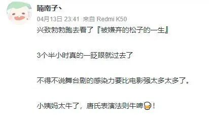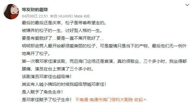 在三个多小时的观剧过程中,观众数度泪目。在剧院,以更为接近的方式去体会松子短暂又富有故事的一生,让观众在松子的身上看到了很多自己的影子,讨好父母、讨好同事、讨好另一半,却唯独忘记了如何爱自己......