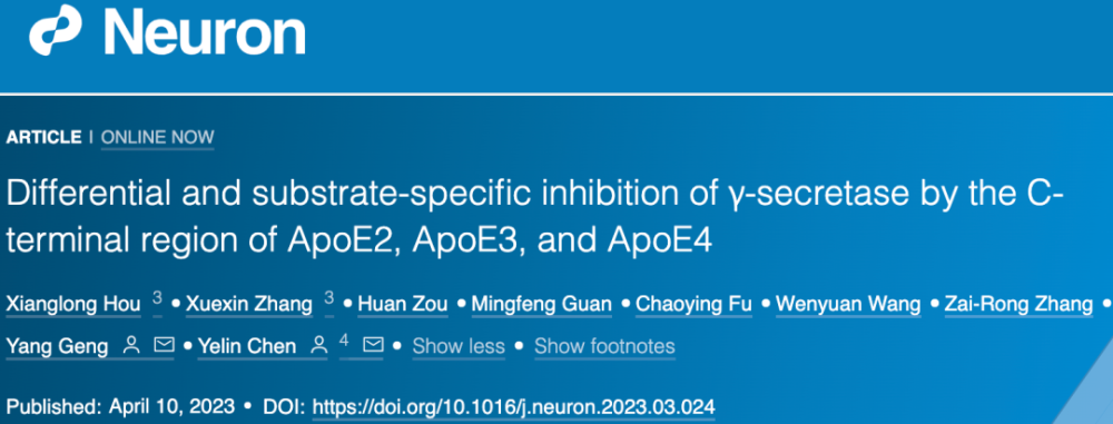 [4].Hou X, Zhang X, Zou H, et al. Differential and substrate-specific inhibition of γ-secretase by the C-terminal region of ApoE2, ApoE3, and ApoE4. Neuron. 2023;S0896-6273(23)00220-9. doi:10.1016/j.neuron.2023.03.024
