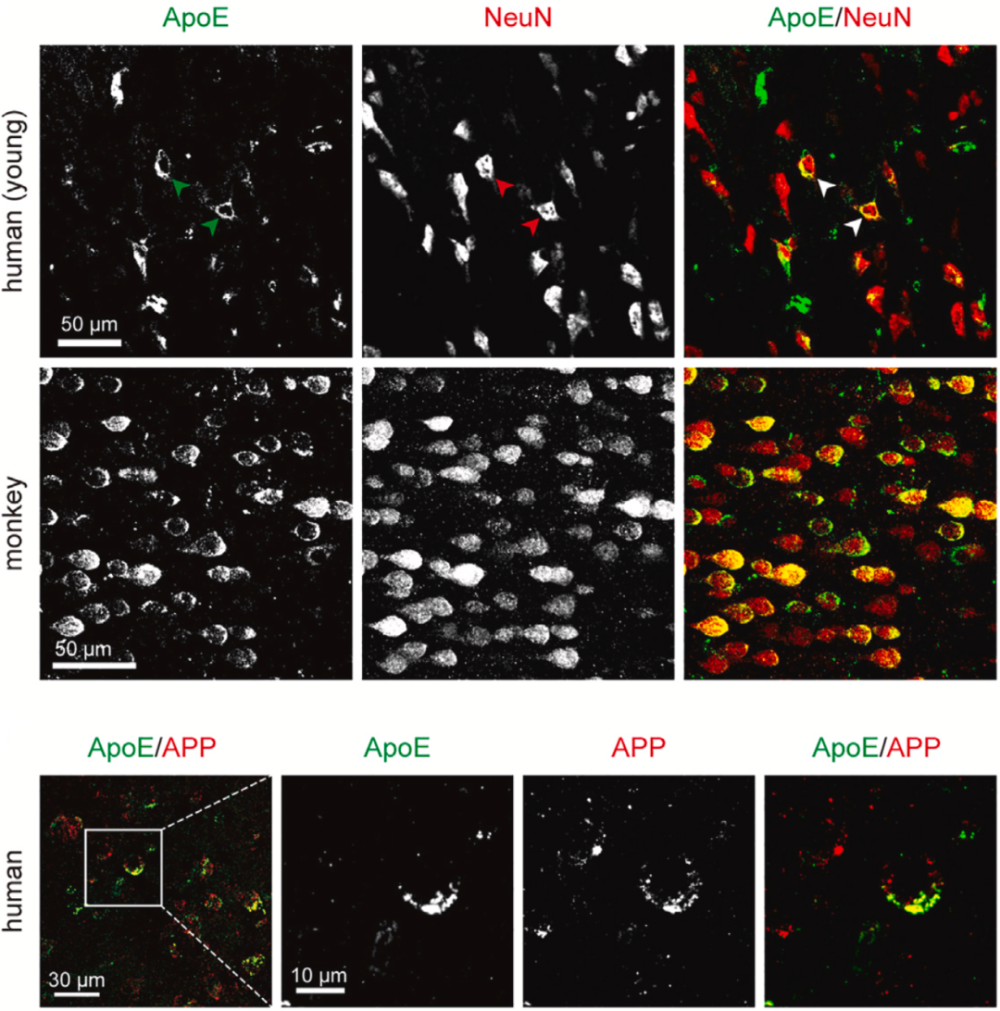 染色结果与之前的研究保持了一致,在神经元和胶质细胞中都检测到了APOE。重要的是,免疫染色显示,内源性APOE和APP在人类皮质神经元中共存,而且二者的荧光信号存在重叠。