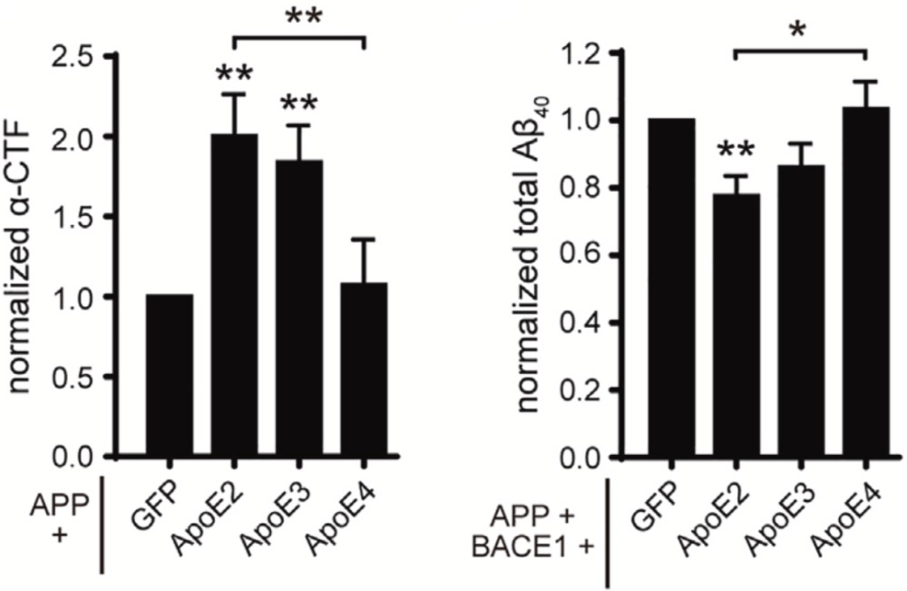 从实验结果来看,在N2A和HEK 293T细胞中,与GFP与APP共表达相比,APOE2或APOE3与APP的共同表达明显增加了α-CTF的水平。值得注意的是,APOE2与APP的共同表达显著减少了总Aβ40的产生。不过,与对照组相比,APOE4和APP的共同表达未能改变α-CTF和Aβ40。