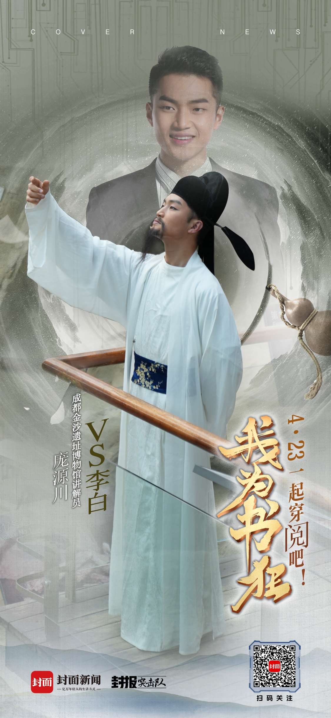 每个短视频都蕴藏着独特的巧思,穿越前后的地点既与人物工作性质密切相关,也与书中角色非常契合。川剧表演艺术家陈智林在北京全国地方戏演出中心亮相,苏东坡则漫步古韵悠悠的园林;文艺范儿十足的陈更推门进入一家书店,黛玉则在氛围感十足的厅堂与薛姨妈娇俏对话;金沙遗址博物馆为讲解员庞源川的穿越提供了十足的便利,让李白漫步在数千年前璀璨的古蜀国遗迹,与神秘而辉煌的古蜀文化并肩而行……