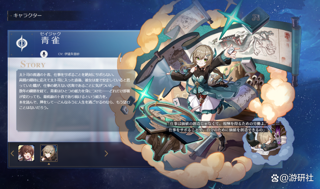 举例来说,《崩坏:星穹铁道》里有一位热衷打麻将的角色名叫“青雀(seijyaku)”,在打造该角色的时候,我们观察了身边的麻将发烧友,“喜欢麻将的人平时是怎么行动的?”“喜欢麻将的人会讨厌什么?”,然后将此类特征融入到了角色身上。(笑)。