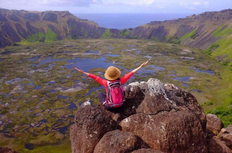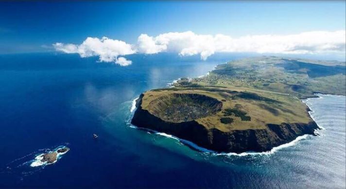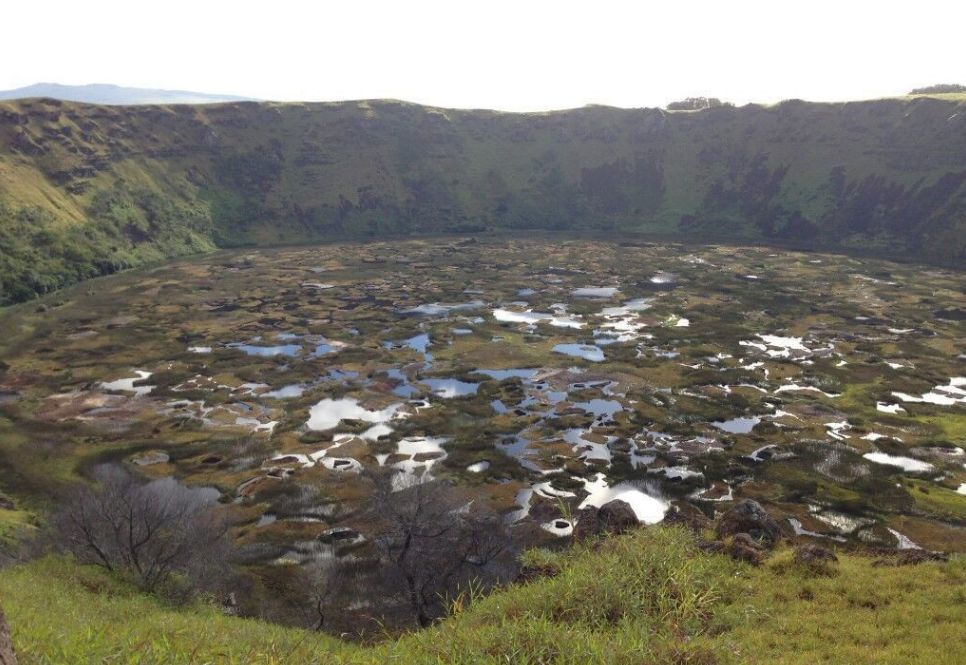 复活节岛的形成源于3个火山的喷发, Rano Kau就是其中之一 。火山口直径超过1公里深度达200多米,火山口底部的淡水一直是岛民的主要水源。火山口临海的一侧有个大缺口,当地人称KariKari 是曾经海水冲击断壁使得火山口不稳定而出现坍塌所致。令人费解的是,火山口底部的芦苇原产自南美秘鲁的Titicaca湖,难道南美安第斯山脉的原住民曾经到过这里?两地的最近距离估计要在4500公里以上。