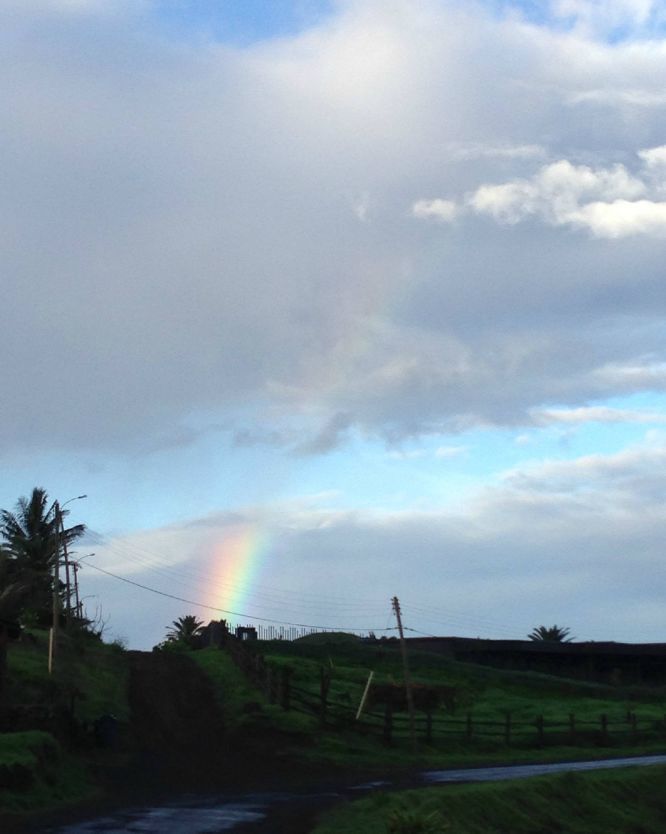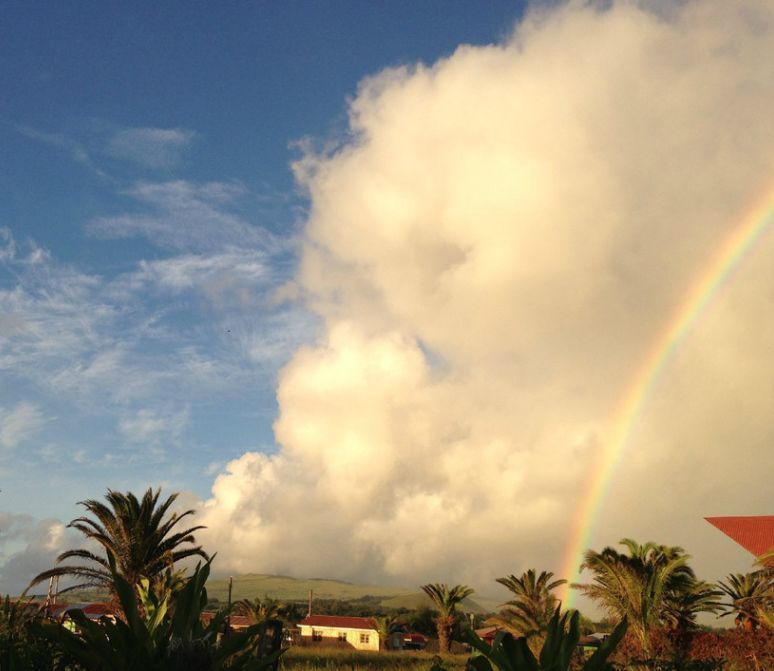 这里属于热带海洋性气候,降水比较多,几乎每天都有间歇性的雨,夜间尤甚,但雨普遍下了一会儿就停了,云彩又飘的很快,所以太阳就又露出了笑脸。在这里你会觉得天很低,这里的天际线、云彩和沙滩有时看起来是连在一起的,在乘飞机降落和离开这座岛屿时会经过大片的云区,从机窗向外看,到处都是白色。也是因为这种间歇性的雨,彩虹则成为了这座小岛的常客。