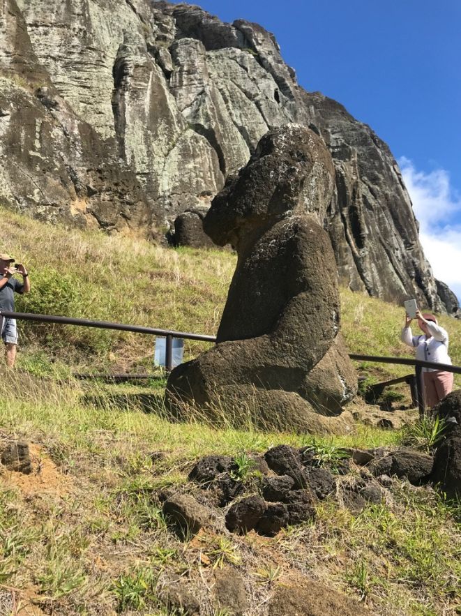 Rano Raraku 是一座火山,也可以说是复活节岛上所有Moai的孵化器。Moai就是在这里的火山山体内,整体雕刻出来然后搬运到岛上的各个位置。现在这里依然散落着400多个或站立或扑倒的Moai ,甚至有Moai一半身体与火山相连 如同未出母体的婴儿。Rano Raraku唯一的一尊跪着的摩艾石像。