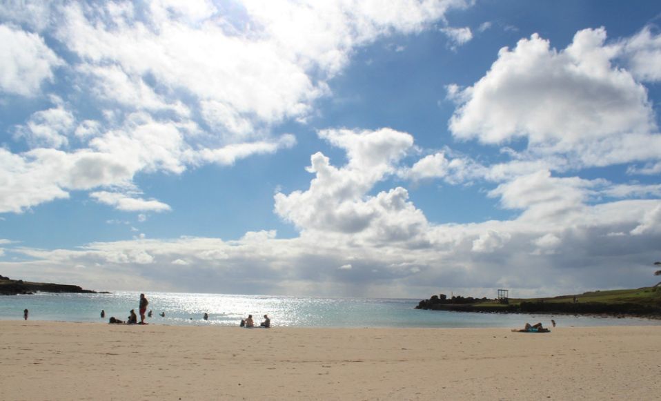 最后来到复活节岛最美丽的海滩 ——Anakena,这里就像一座度假村一样,岸边有酒吧,头上有椰子树,很多人在游泳和晒太阳。海滩的不远处有一组7个摩艾石像,叫Ahu Nau Nau,这群摩艾石像明显和Tongariki的长得不一样!因为他们都戴着红色的帽子。