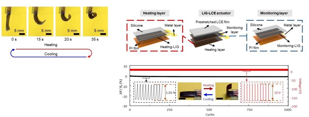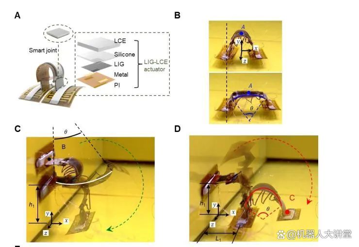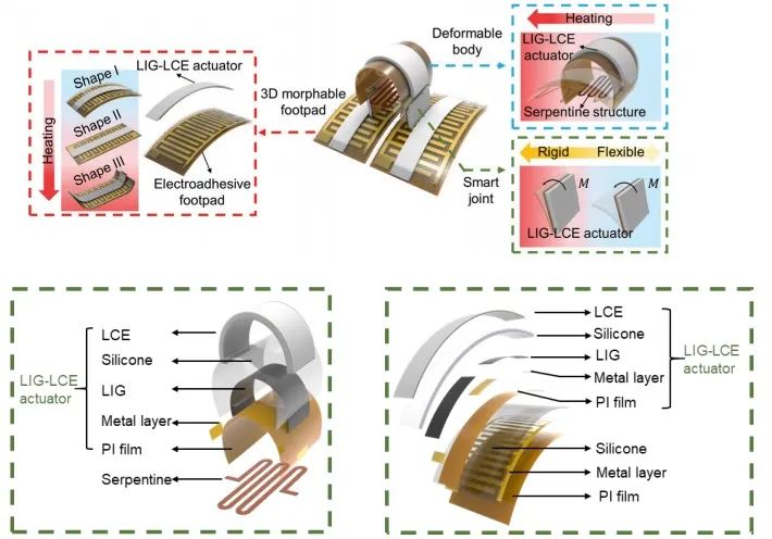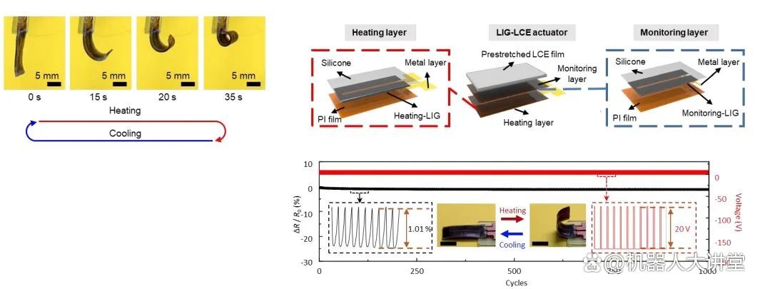 它们均由液晶弹性体(LCEs)材料为基础制成。这是一种智能材料,在外界刺激下,例如热、光、电、磁、pH、湿度等,材料会发生宏观形变,撤去外界刺激后,又会恢复原状。