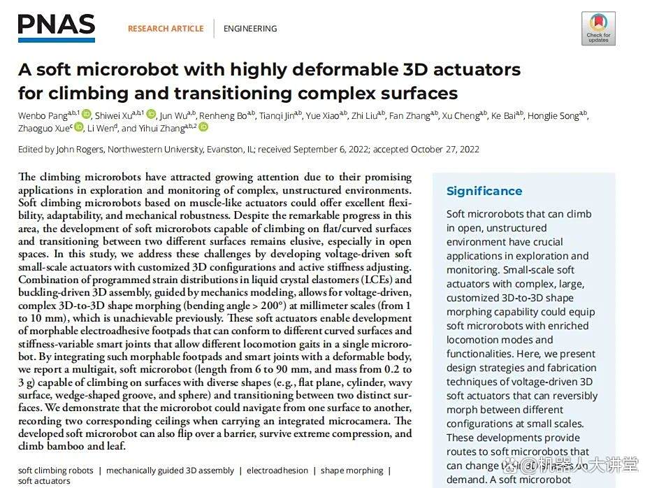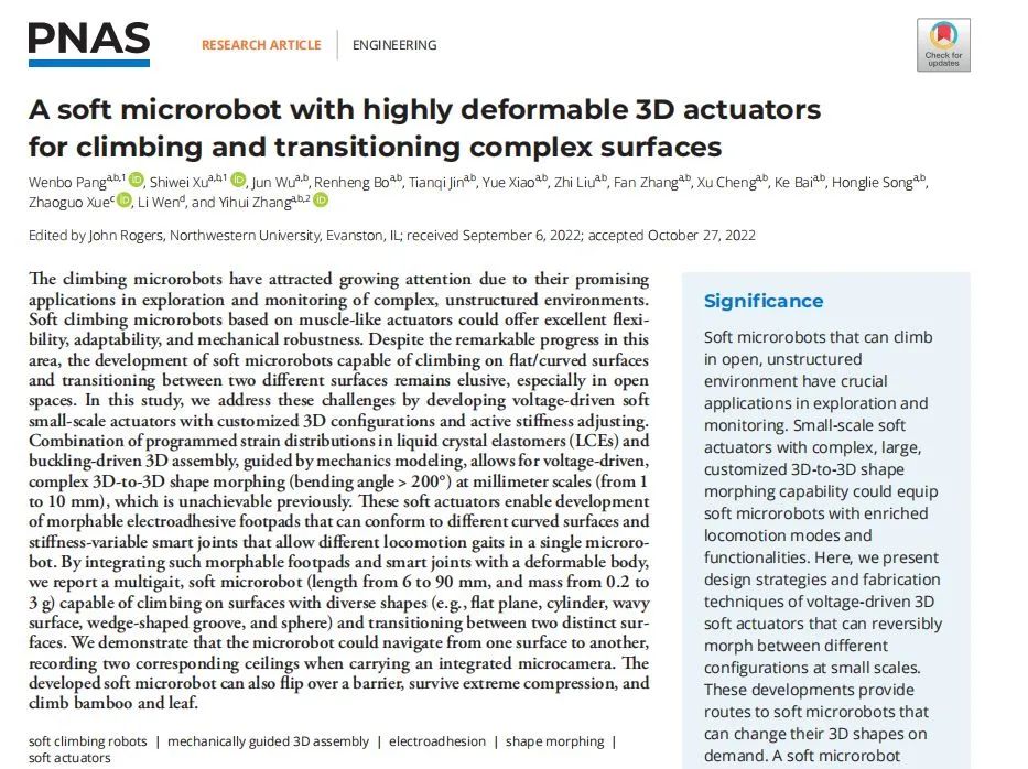 这个机器人界的“攀爬冠军”出自清华大学航天航空学院张一慧教授课题组,相关研究成果于近日在《PNAS》(美国科学院院)以《一种基于可变形三维驱动器的可在复杂表面攀爬和过渡的微型软体机器人》为题发表。