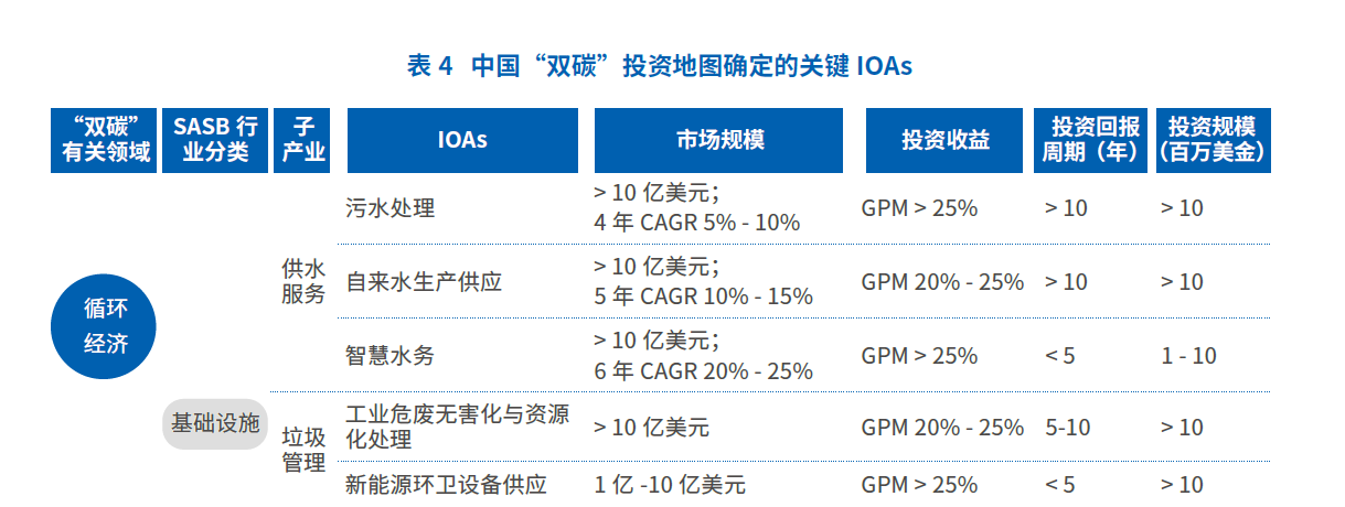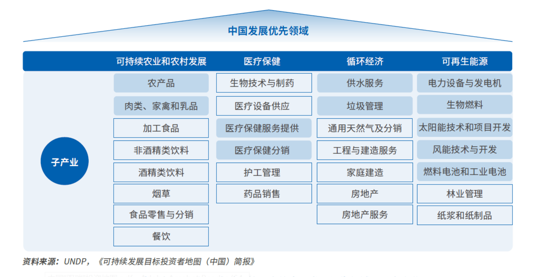 作为一份“投资地图”,报告通过一套标准化的分析框架,确定了目前中国在双碳领域最具潜力的投资领域。这些领域一方面受到政府政策的支持,另一方面也具备重组的市场需求。在之前2021年的《地图》中,UNDP确定的重点投资机会领域有四个,即可持续农业和农村发展、医疗保健、循环经济、可再生能源。相关的子产业见下表:
