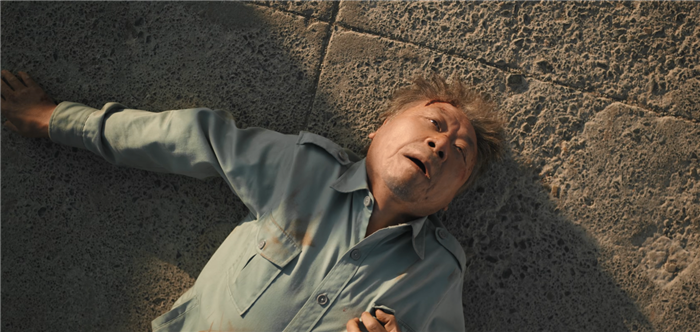 在去车站的路上,他在玉米地方便,但后面镜头一转,他继续前进,身后躺着一个和他穿着一样的人。
