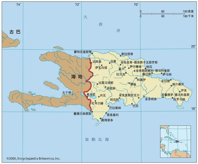 海地岛又名伊斯帕尼奥拉岛是加勒比海中第二大岛,仅次于古巴,面积76,480平方公里,人口2150万人,分属海地和多米尼加两国。西部约2.8万平方公里(占全岛面积的36%)的土地归海地国所有,剩余领土为多米尼加国家所有。海地是世界穷国之一,多米尼加虽然算不上发达国家,但是和海地相比已经算是很富裕的了,多米尼加人均GDP约为6700美元,折合成人民币为42000元,而海地的人均GDP仅有740美元,多米尼加是其9倍之多。