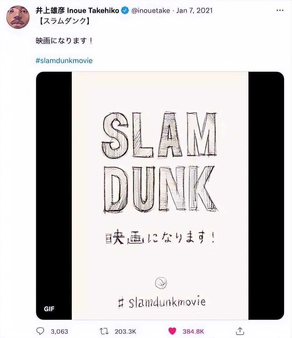 直到2021年1月7日,井上雄彦在自己的社交账号上宣布《灌篮高手》电影版投入制作,令全网都为之沸腾。