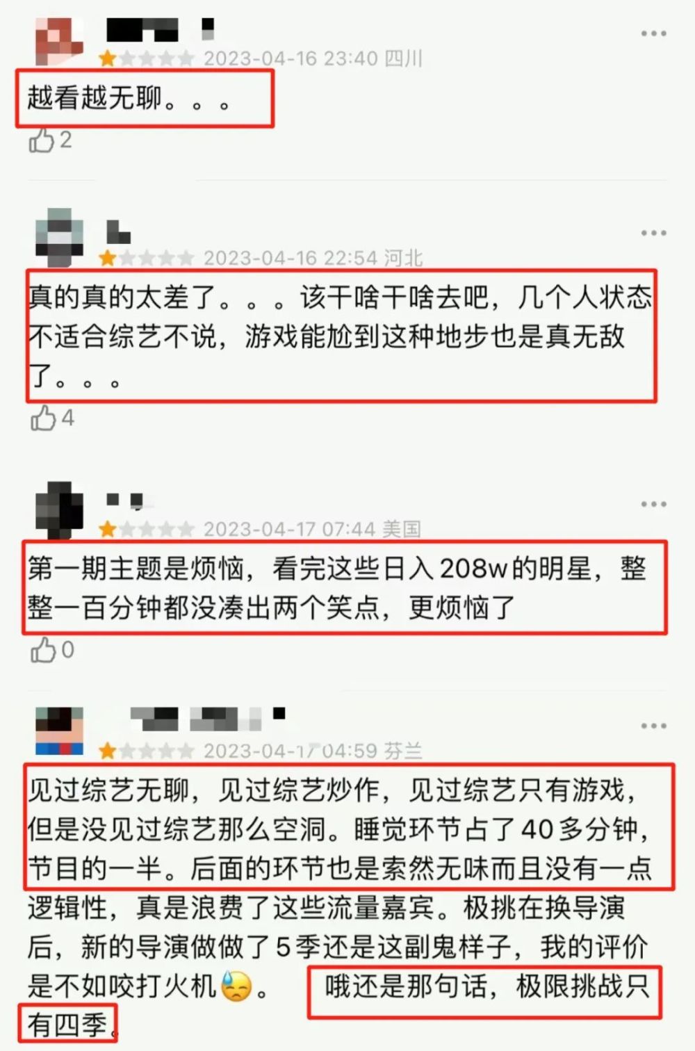一星差评几乎“占领”了评论,大家的差评理由也很一致,就是认为节目空洞无聊,有人直言《极限挑战》已经“名存实亡”。