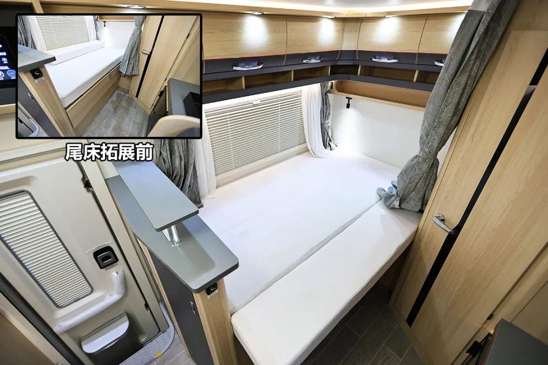 卧室赋予了空间沉稳静谧的基调,灯光充足但并不抢眼,给人一种安心的感觉,焕发出清新的治愈感,令人很快地放松情绪。尾床位长度1.85米,外侧床板为翻转结构的可拓展设计,可以为车内过道腾出更多空间,需要更大空间时可将床位宽度拓展至1.25米。床垫采用12厘米厚的高弹复合材质。驾驶室上方的双人床尺寸达到2.22×1.58(米),双床睡卧,充满自信。