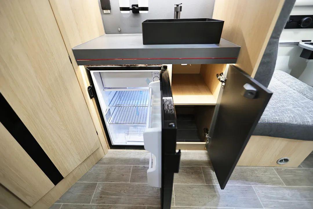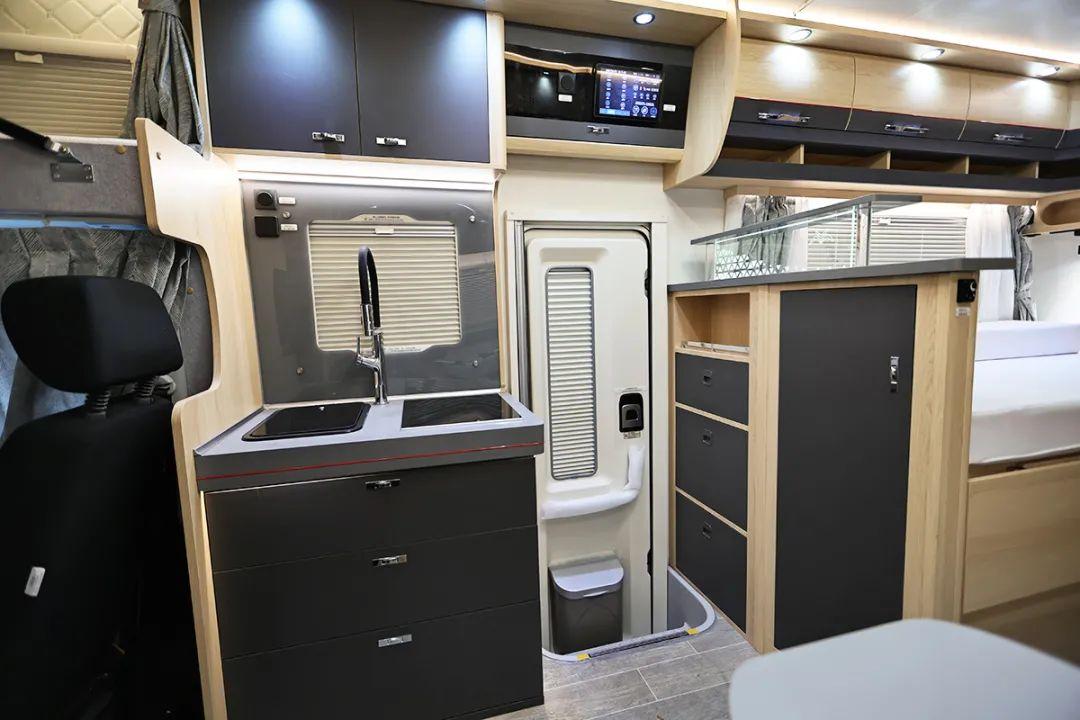 厨房区比较少见地布置在了驾驶室后方。灶台是1200W电磁炉,主要是应对天气不佳无法使用车外灶台时,可以在车内吃个火锅煮个面。洗菜池的水龙头也挺有亮点,感应式出水,而且水龙头采用软管设计可以灵活使用。洗手台盆上方柜门打开为带照明灯的梳妆镜,内部的空间也可以收纳护肤品,非常适合作为女生梳妆台来使用。上方隐藏了一台1P的壁挂式空调,冬暖夏凉。