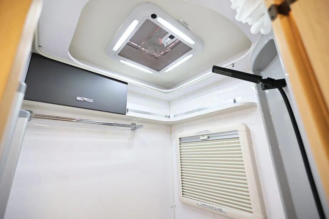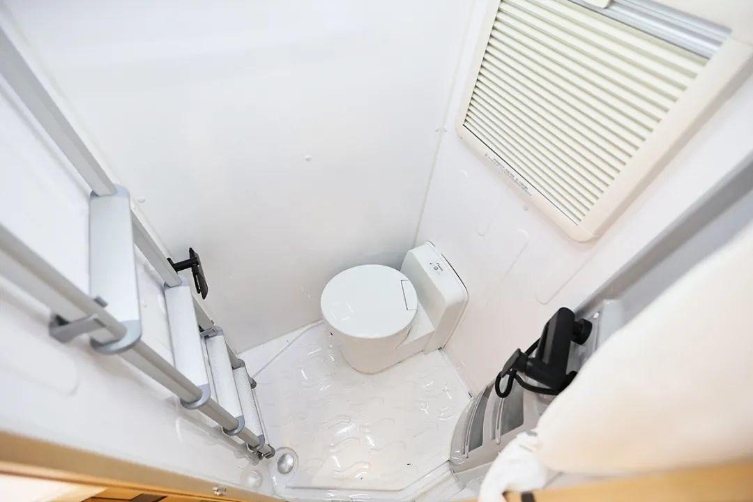 内部为吸塑成型的防漏水整体式卫生间,为用户提供如厕和淋浴的空间,内部面积实测约0.8平米,配备了可旋转的房车座便器、独立淋浴器及双向换气扇。新车的净水箱容积为300升,配备电热水器。