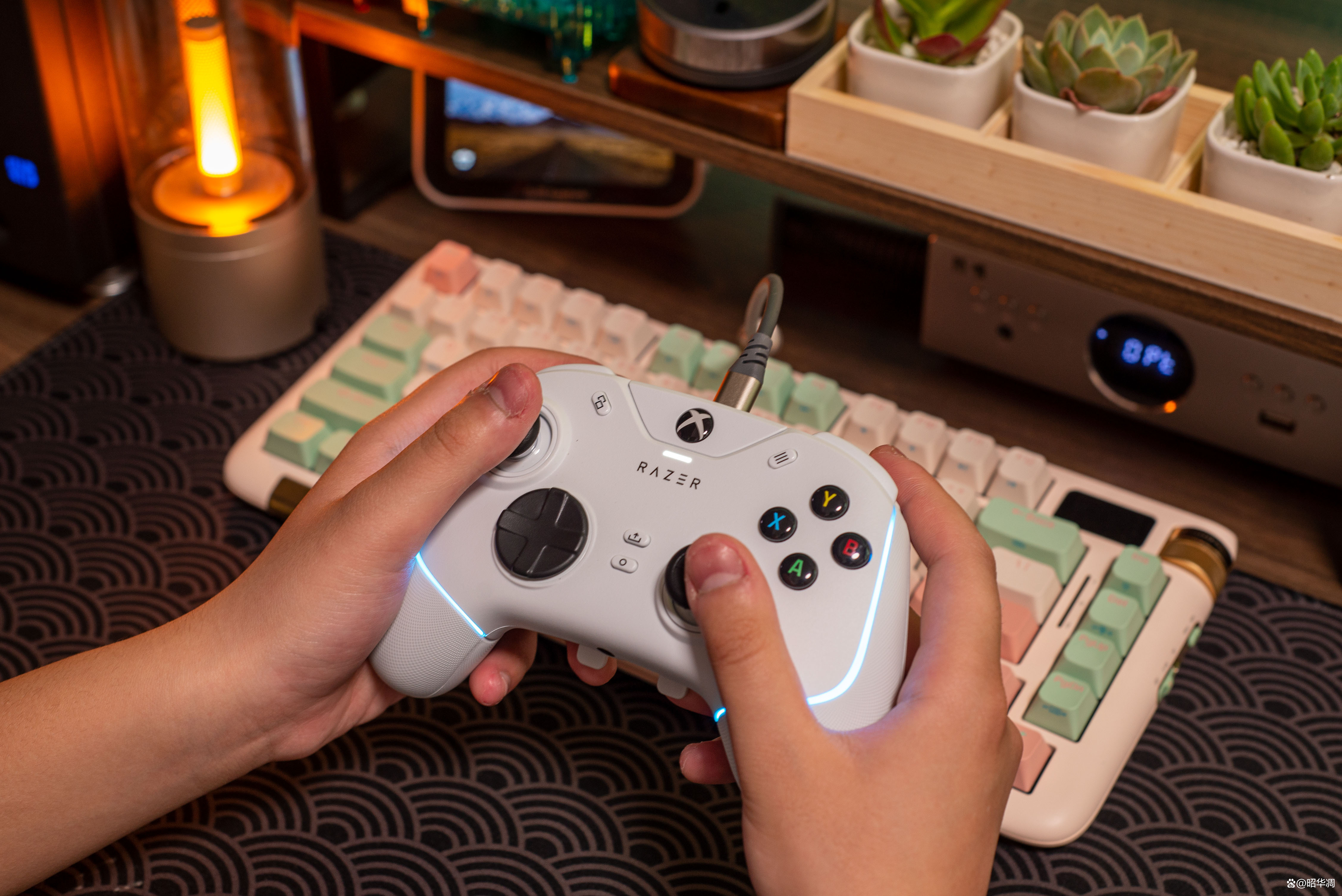 ▼灯效方面是雷蛇的强项,连接主机时两侧的灯带和 XBOX 标示都会亮起,1680W 颜色和丰富的灯光效果可以带来更沉浸的游戏体验,另外,手柄支持 RAZER CHROMATM RGB 灯效,可与雷蛇的其他设备实现灯效联动。只是可惜按键区域没有灯光有点小遗憾。