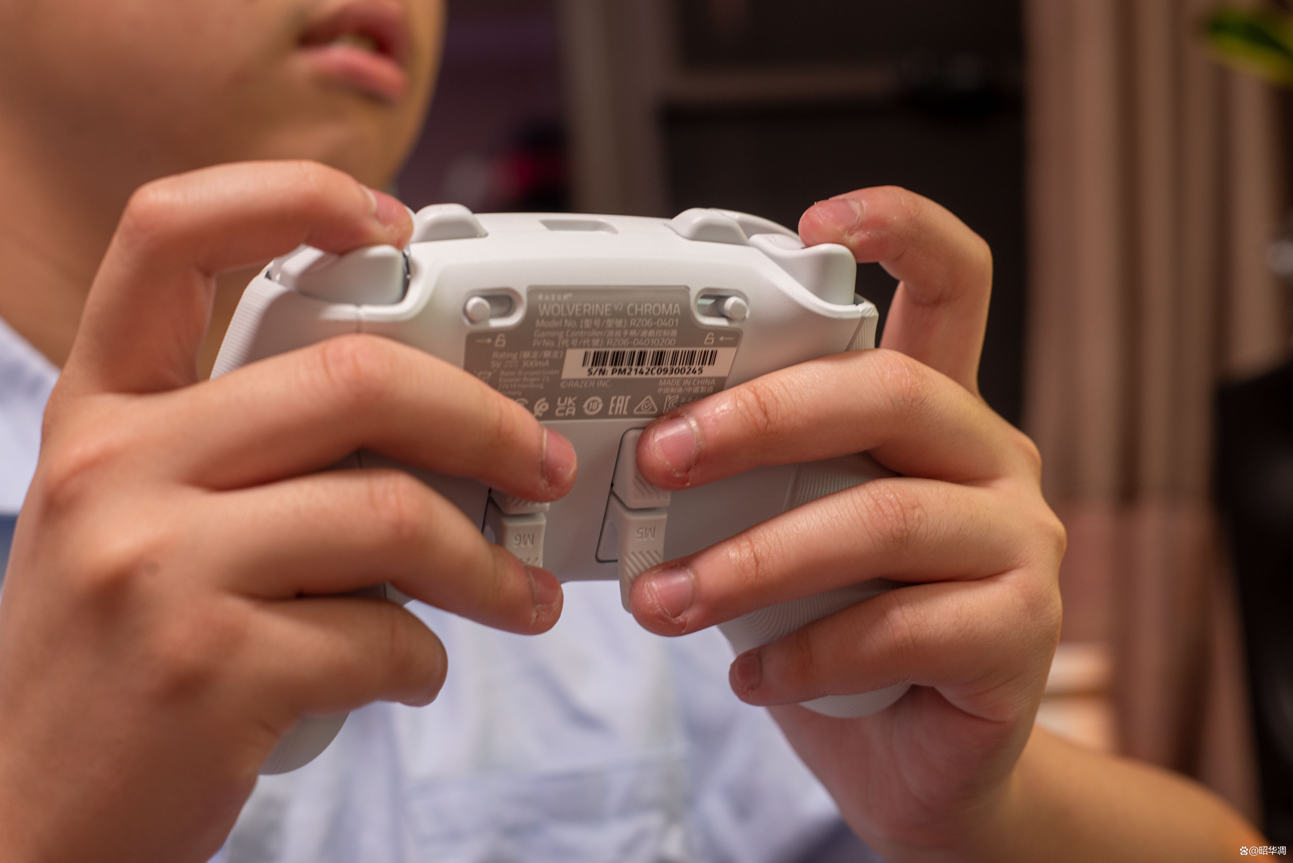 ▼上方两个扳机锁对应肩键的键程调节,线性激发与快速触发两种模式对应不同游戏类型。可以看到,虽然按键数量较多,但双手握持时手指都很自然的落在按键上,使用上没有什么不适感。