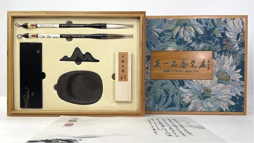 文房雅集内含湖笔2支(羊毫、狼毫),定制墨条1块,五寸龙纹端砚1个,紫光檀书镇1个,紫光檀笔搁1个。外包装采用“竹艺+布艺”的搭配,栩栩如生的花儿如同莫奈笔下花园里盛开的鲜花,富有生机,又着色舒服,呈现了清新的油画质感,使整个礼盒更显雅致。