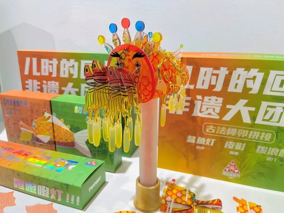 鳌鱼宝盒是结合五项非遗技艺于一身的教育研学产品,它是以我们杭州鸬鸟的非遗鳌鱼灯为载体,其中结合了厦门拨浪鼓,陕西皮影,整体结构是中国榫卯技艺拼接而成,手柄里面的花纸是非遗丝网印刷工艺,我们是想将我们非遗技艺以这样崭新的模式继续传承下去。