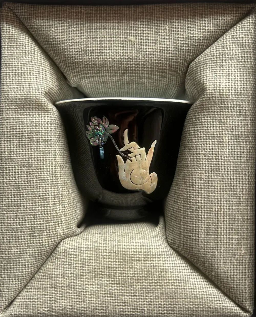 螺钿瓷杯,是螺钿漆器在现代生活的应用,是舟山的螺钿镶嵌和漆器两大非遗传统工艺在瓷器上的完美结合。精选夜光螺、鲍鱼贝等优质贝壳,经螺钿大师独到的压片处理,裁切成纤细的图案、纹饰,再进行雕刻、上漆、打磨、抛光等工序,从选贝到成器,经数十道工序,遂成光泽如锦如霞,别具雅丽的螺钿瓷杯。