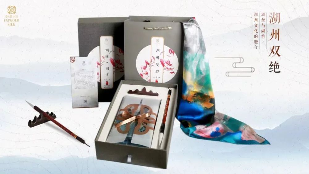 “湖州双绝”整合两大特色产品延续湖州传统文化,丝巾设计灵感来源梦笔生花,采用真丝素绉缎面料。素绉缎面料亮丽高贵、丝滑柔软,更好地呵护肌肤。湖笔选用狼毫(材质),尖锐有力、弹力十足。笔杆选用红木木材,质地温润、便于保养。