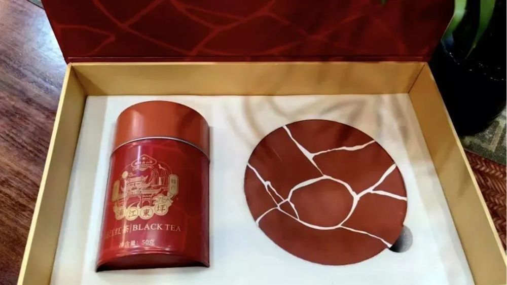 礼盒图案以浦江地图为主图,点缀仙华山、江南第一家以及代表上山文化的水稻与大口盆,背景色为红衣彩陶裂纹,突出浦江文化属性;色彩为红与金,红色表示喜庆、金色寓意丰收。礼盒中的大口盆仿真品是真迹的缩小版,颜色上还原了上山彩陶的红衣陶胎颜色,裂纹与修补的裂痕相近。它让历史文物通过文创走进生活日常,更好地宣传浦江与浦江文化。