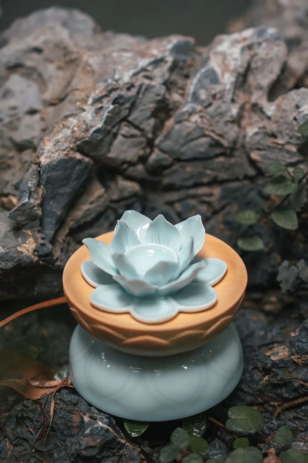 海防馆将镇海绵延万年的莲文化与海防海丝历史文化相结合,以馆藏文物北宋越窑青釉莲瓣纹瓷粉盒为原型,加以创新和扩香的实用功能,设计制作了“镇有荷华”莲盒香薰,并于2022年11月成功申请了国家专利。香薰下半部分为桧木实心底座,上半部分请青瓷艺人手工制作,一莲一品,将盖倒置,可作为底座,以香沁花,禅意绵绵,有安神静气之效。