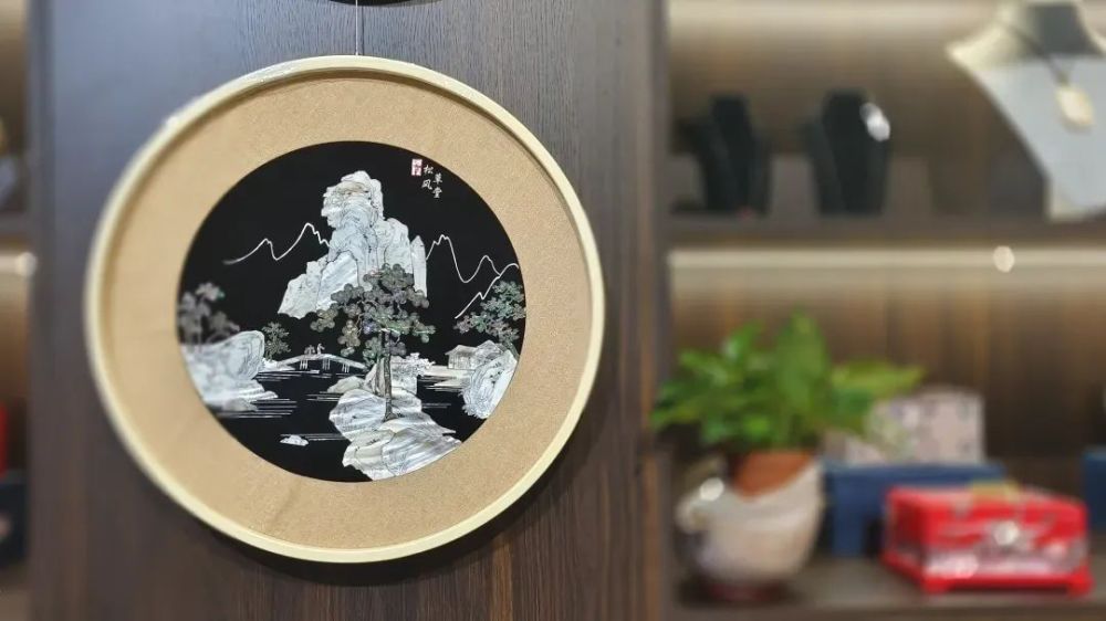 温州螺钿在宋代曾经做过贡品,其工艺号称天下一绝。此画以传统螺钿工艺选用宋画题材,利用现代的简约工艺辅以棉麻,做成可挂可摆的适用于家居的旅游商品,深受游客喜爱。