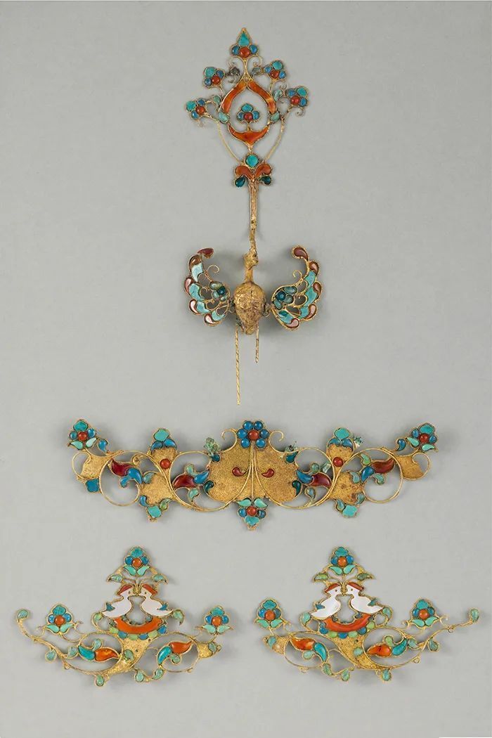 凤及鸳鸯衔花枝纹冠饰唐(618-907年)金镶绿松石、红玛瑙、琉璃、砗磲 梦蝶轩惠赠 香港故宫文化博物馆藏??香港故宫文化博物馆藏