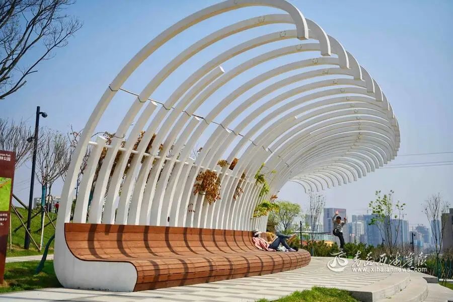 随后,记者来到紫藤萦绕的紫语花廊。花廊下,一名学生正倚靠在座椅上,专注阅读手中的书籍。“在家里学不进去,总觉得闷得慌,公园开放以后,我经常来这里读书,现在已经养成了每天来这里学习的习惯。”放下手中的书本,她笑着对记者说,“不管是娱乐还是学习,这里都很容易让人沉浸其中。”