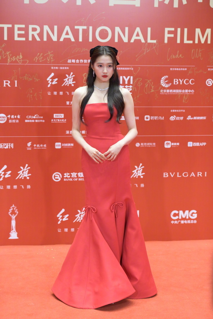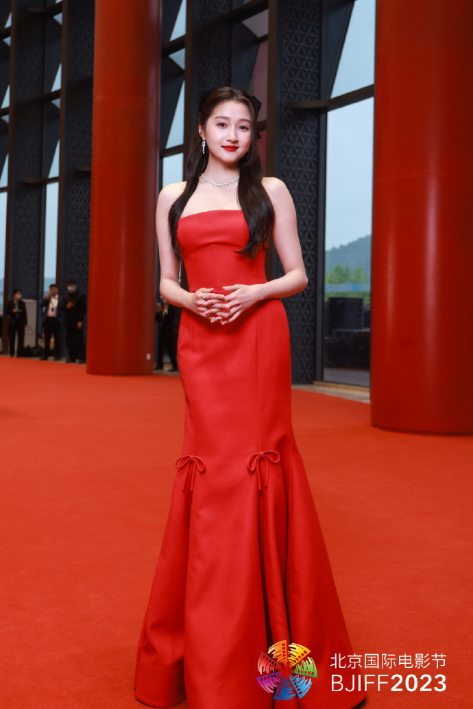这次,关晓彤上身的是一套红色抹胸鱼尾长裙,由于和红毯地板背板撞色,这身红色长裙并不能一眼将她凸显出来。