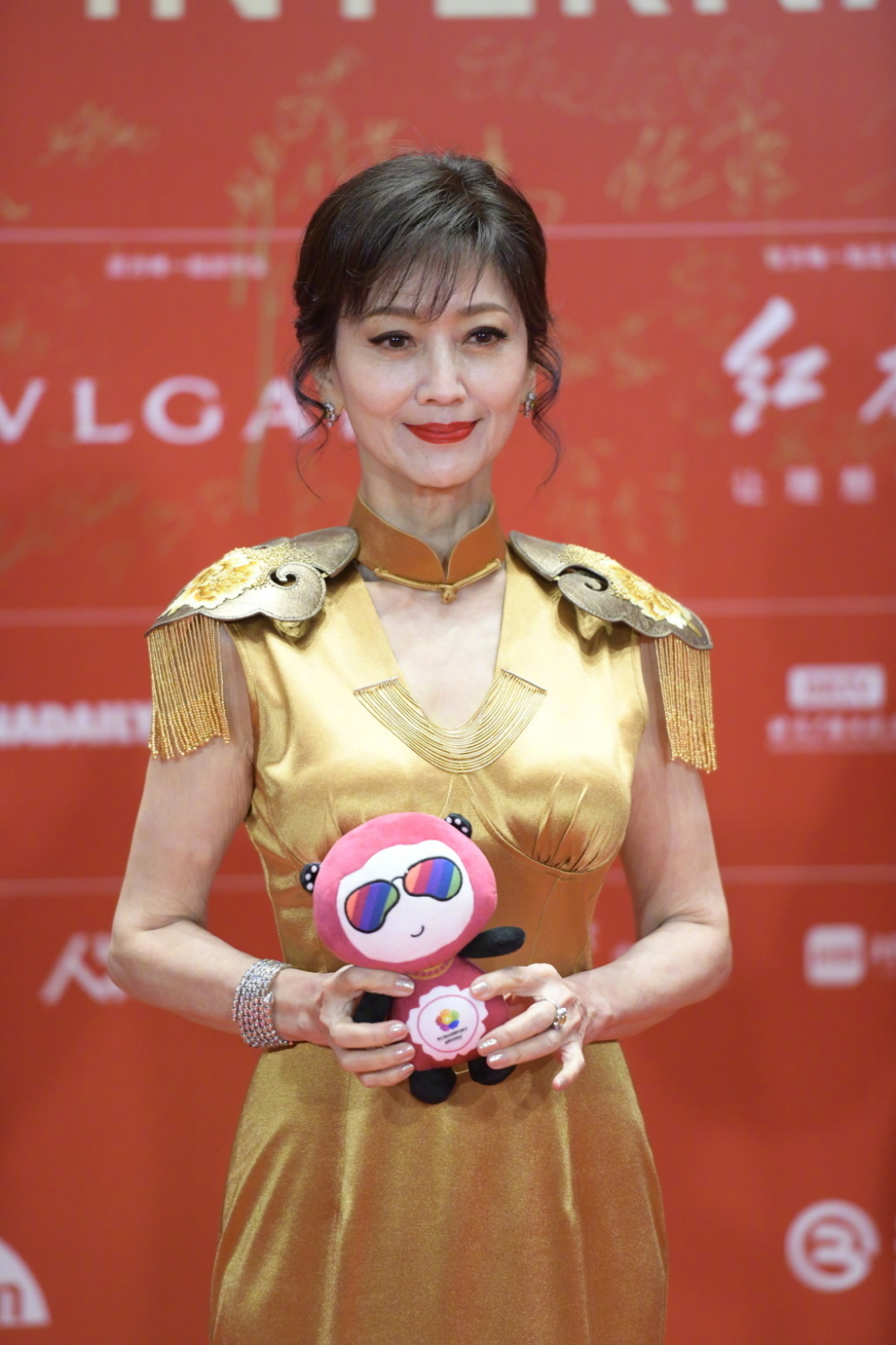 今年69的赵雅芝是同一种后辈走上红毯的,一身金黄色的礼服站在人群中很扎眼。