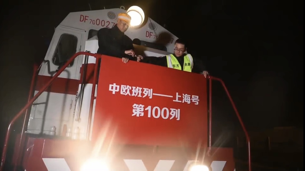4月22日晚,随着一声汽笛长鸣,“中欧班列-上海号”第100趟列车满载着空调、叉车、全涤印花布等55个集装箱货物,从上海发车。