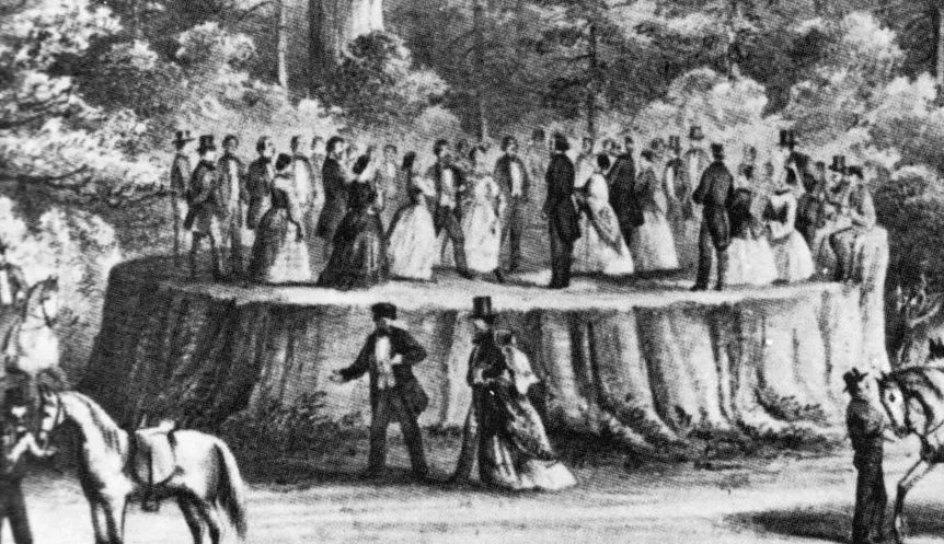 人们聚集在巨杉树墩之上的图画 | Wikimedia Commons